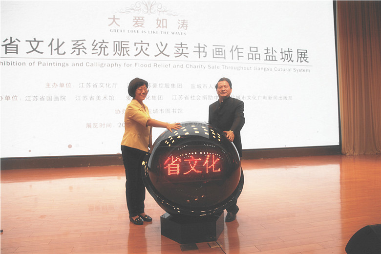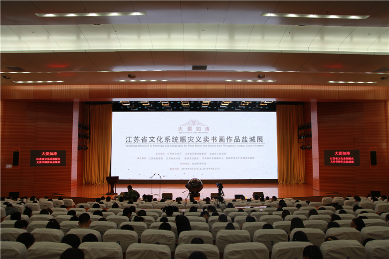 由江蘇省文化廳、江蘇省蘇豪控股集團(tuán)、鹽城市人民政府共同主辦,江蘇省國畫院、江蘇省美術(shù)館、愛濤文化集團(tuán)、江蘇省社會(huì)捐助中心、鹽城市文化廣電新聞出版局共同承辦的“大愛如濤——江蘇省文化系統(tǒng)賑災(zāi)義賣書畫作品鹽城展”,于9月21日在鹽城市圖書館正式開幕,為期一周。