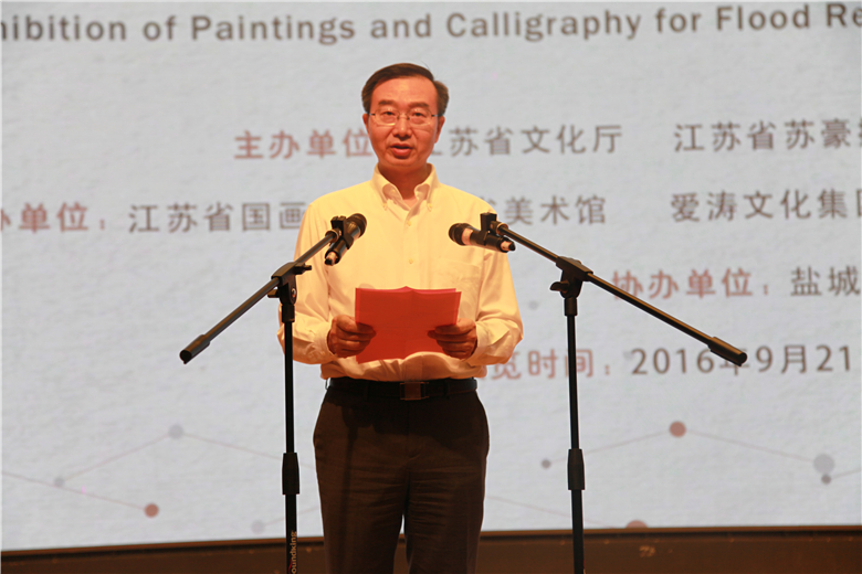 開幕式上,江蘇省文化廳黨組書記、廳長徐耀新與中共鹽城市委常委宣傳部長陳紅紅共同為展覽按下啟動(dòng)球。 中共鹽城市委常委、宣傳部長陳紅紅,愛濤文化集團(tuán)黨委書記、董事長張發(fā)松,受災(zāi)地區(qū)代表阜寧縣副縣長吳正年致辭,愛濤文化集團(tuán)常務(wù)副總陳云梅,射陽縣人民政府副縣長季風(fēng)、鹽城市文廣新局出版局副局長王勝利,以及阜寧縣、射陽縣文廣新局、鹽城市圖書館、市縣區(qū)書畫家等代表出席開幕儀式。鹽城市文廣新局局長季德榮主持開幕式主持開幕儀式。