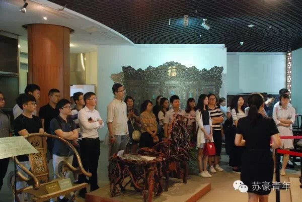 活動(dòng)歷時(shí)半天,團(tuán)員青年先跟隨講解員的步伐,參觀了藝術(shù)館館藏珍寶。從刺繡絲織民俗館到紅木雕刻家具館再到玉石陶瓷漆器館、字畫館等。現(xiàn)場的年輕同事很多都是第一次看到如此眾多的珍寶,被工藝精品的藝術(shù)魅力深深折服。