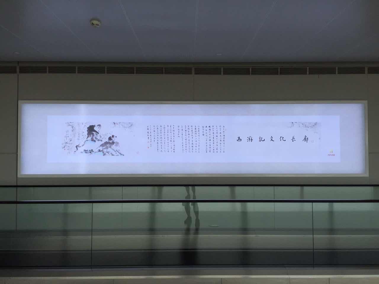 下了飛機疲憊的倦容適合欣賞一些美景,隨著輕輕的步調,環顧四周,灰白色的墻上已換上新裝,沒有半點亂花漸欲迷人眼的浮躁感,不驕不躁的水墨情呈現給燈箱是再合適不過的,整個T2航站樓的長廊儼然開拓了一副新天地,斜陽西照,深色的柱子上一幅幅西游記的經典場景回放著映入眼簾,穿過獨具特色的長廊,陽光透過玻璃墻,照射在灰色的地面上。恢弘大氣的長廊里,有一種內斂含蓄的文化底蘊在涌動,長廊如紙,柱體如虹,旅客的性情、思緒,融入在造型、筆墨、意蘊之中,整個長廊里流動著平實敦厚,溫潤超逸的謙謙之音,旅客亦喜焉,似樂也。