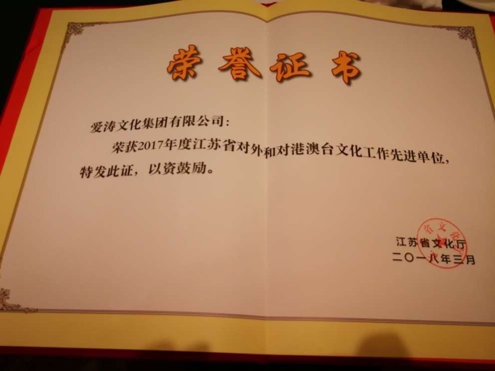 愛濤文化集團(tuán)榮獲2017年度江蘇省對外和對港澳臺文化工作先進(jìn)單位稱號
